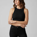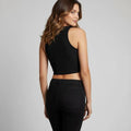 Top feminino modelo tank top, confeccionado em algodão e poliéster, com tecido de alta elasticidade e acabamento em broadcloth. Peça de comprimento curto, ideal para o verão, com design moderno e visual minimalista voltado ao público adulto.